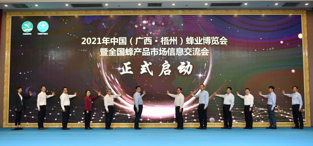 4月23日,2021年中国蜂业博览会暨全国蜂产品市场信息交流会在广西梧州开幕。本次大会由中国养蜂学会、中国蜂产品协会、广西农业农村厅、梧州市人民政府主办。农业农村部畜牧兽医局副局长孔亮、中国农业科学院蜜蜂研究所所长彭文君、中国养蜂学会理事长吴杰、中国蜂产品协会会长杨荣、广西农业农村厅副厅长梁纪豪、梧州市委书记全桂寿、梧州市长钟畅姿等领导出席开幕式。