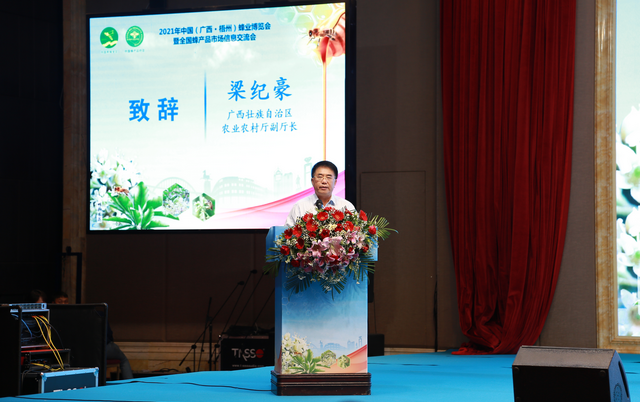 梁纪豪在致辞中表示,蜂产业是广西特色鲜明、优势明显的产业,在全国蜂产业中占据重要地位,以特色、优质蜜种为主的广西大宗商品蜂蜜,深受粤港澳地区消费者欢迎。自治区各级党委、政府高度重视蜂产业发展,自治区专门设立了广西养蜂指导站,全方位为蜂农提供技术指导。我区将以此次大会为契机,加强学习交流,推动养蜂机具和饲养技术标准化,提高蜜蜂饲养技术水平,加大蜜粉源植物人工栽培、保护与利用力度,把蜜蜂授粉作为现代农业的重要配套技术措施予以扶持,进一步把蜂产业打造成为全国有影响力的优势特色产业。