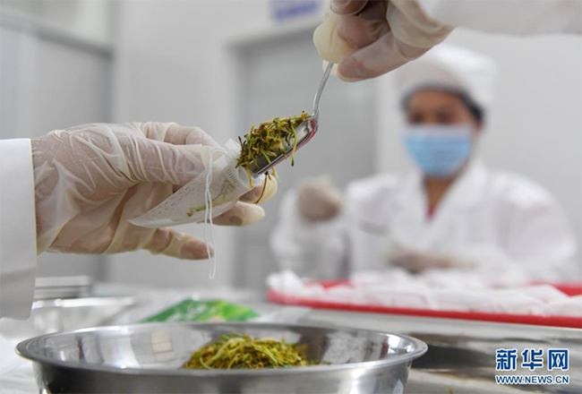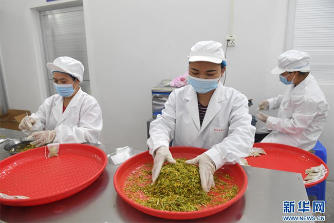 在马山县加方乡大陆村,村民在包装金银花。