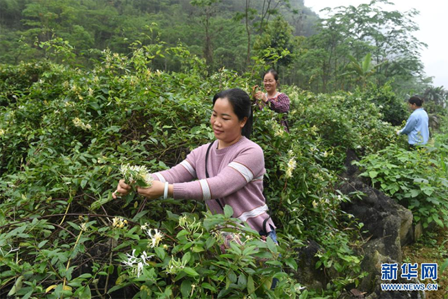 时下,广西马山县进入金银花采摘季,当地农民抢抓农时,采摘金银花供应市场。马山县金银花种植面积超过4万亩,是助力当地农民增收的重要产业。