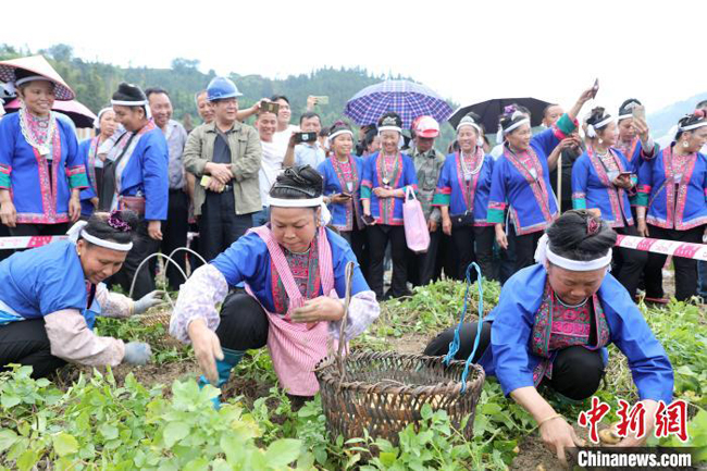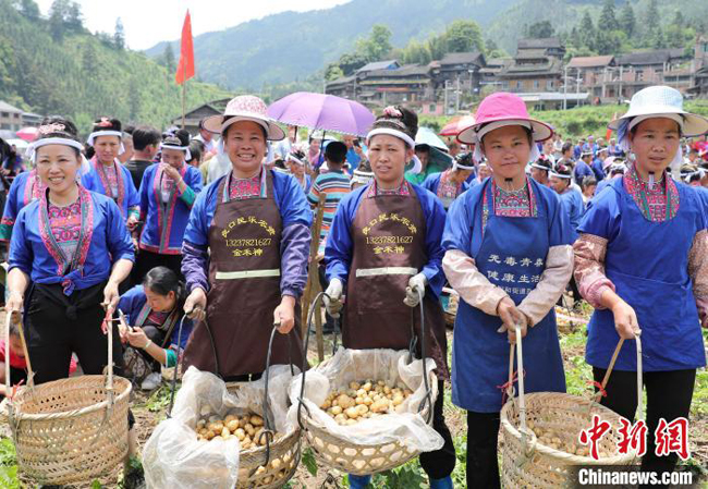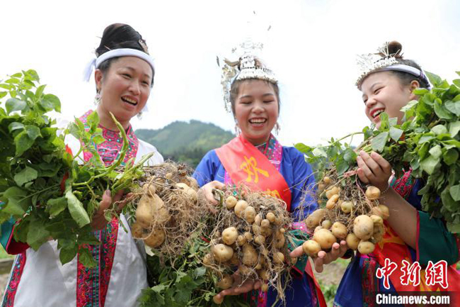 几名侗族妇女在展示挖土豆比赛成果。