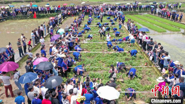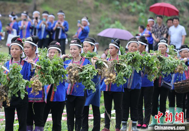 侗族妇女挑着土豆巡游。