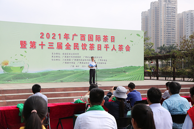 为在我区营造“知茶、爱茶、饮茶”的良好文化氛围,提升广西茶产业的知名度和美誉度。5月9日,由自治区农业农村厅主办、广西茶叶科学研究所、广西农业职业技术学院承办的2021年广西国际茶日暨第十三届全民饮茶日系列活动之一——千人茶会在南宁八桂田园启动,茶会以“百人布席,千人饮茶”的形式,通过品茶、习礼,传承中华传统的茶文化。自治区农业农村厅一级巡视员郭绪全、广西农业职业技术学院党委书记杨昌鹏出席启动仪式。
