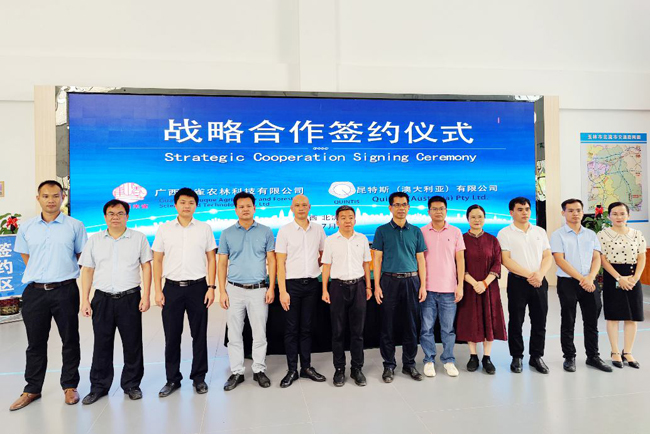 近日,广西朱雀农林科技有限公司与澳大利亚昆特斯有限公司在广西北流市“两湾”产业融合发展先行试验区招商中心举行战略合作签约仪式,玉林市林业局、玉林市商务局、北流市经贸科技局、北流市投资促进局等相关单位领导见证签约。