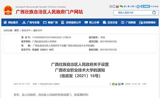 近日,广西壮族自治区人民政府门户网站发布了设置成立广西农业职业技术大学的通知。根据《教育部关于同意广西大学行健文理学院转设为广西农业职业技术大学的函》(教发函〔2021〕74号),教育部同意整合广西大学行健文理学院、广西农业职业技术学院办学资源,设置广西农业职业技术大学,学校标识码为4145016205;同时撤销广西大学行健文理学院、广西农业职业技术学院的建制。