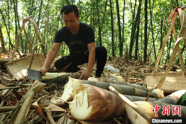 盛夏时节,走进柳州市柳城县沙浦镇古仁村新古仁屯,茂密青翠的竹海里,遍地是鲜嫩肥硕的甜笋,这正是螺蛳粉的“灵魂”——酸笋最好的原料。因此,挖笋成为当地村民眼下的“头等大事”。