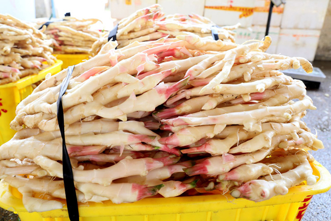 “现在品质好的子姜收购价在2.1—2.2元/斤,收购的子姜经过保鲜包装后,主要销往湖南、四川、重庆等地,红头、白嫩、细长的子姜品质较受市场青睐。再过10天将迎来子姜销售高峰期,高峰期一天收十万斤左右。”本地收购商韦树盆说。