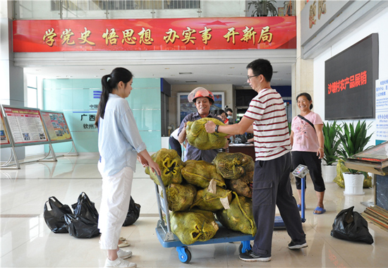 8月20日下午,南方电网广西钦州灵山供电局驻灵山县陆屋镇沙塘村乡村振兴第一书记王晖光到该局办公大楼组织开展农产品展销。离展台还有一段距离,就已经听到了他的带货吆喝。