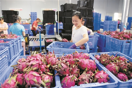 乘着广西现代特色农业高质量发展的东风,红心火龙果也迎来了发展的好时机。“以广西金福农业有限公司(以下简称‘金福农业’)、广西金穗农业集团有限公司、广西农之源农业投资有限公司为代表的企业在国内水果行业崭露头角,推动形成火龙果、沃柑、香蕉等水果产业集群,形成了良好的龙头企业带动作用。”隆安县农业农村局副局长凌加青表示,近年来,该县坚持一个企业带动一个产业的发展理念,大力引进和培育龙头企业,促进科技、人才、资金等生产要素集聚,有效地带动了广西现代特色农业高质量发展。