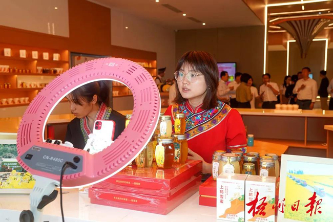 主播在广西梧州甜蜜家蜂业有限公司展厅内进行直播带货。