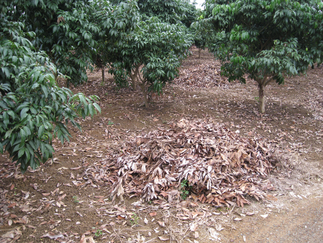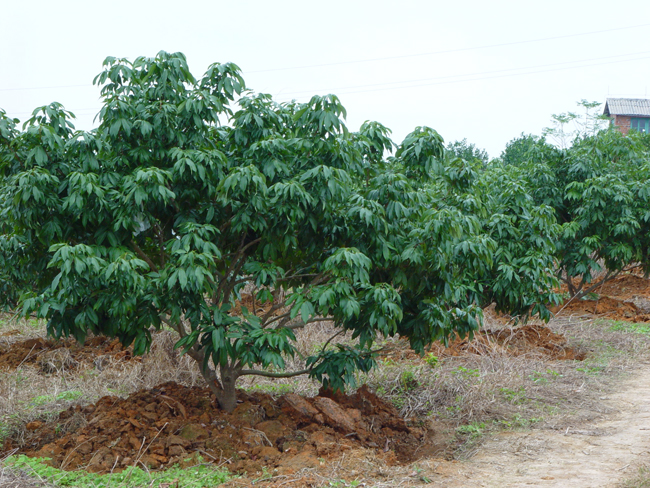 荔枝园结合施基肥挖深翻改土沟,一般在11月上中旬挖改土沟,晾晒一个月左右,12月中下旬施入基肥并回填土,通过切断部分根系,起到控冬梢的作用。