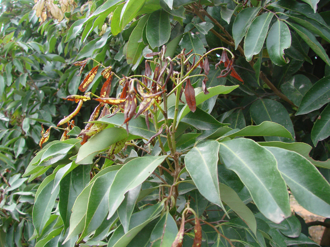 ②杀冬梢。冬梢抽生后喷施生长调节剂或杀梢药物进行杀梢,促使冬梢残桩和秋梢成花。方法是在冬梢抽生至叶片初展时喷药杀梢;如果冬梢叶片已充分展开,则杀梢效果不好,且使用的生长调节剂浓度较高,易引起落叶。使用40%乙烯利水剂杀梢其用量为15~20毫升兑水15公斤;或用40%乙烯利水剂8~15毫升+15%多效唑可湿性粉剂15克兑水15公斤喷施,后几天嫩叶卷曲脱落(图5),嫩梢茎上部干枯。生产上常用“杀梢素”、“帮你控”、“梢即枯”等药物进行杀梢,这类药物杀梢速度快,喷药1天后嫩梢干枯(图6),且对成熟叶片伤害小。