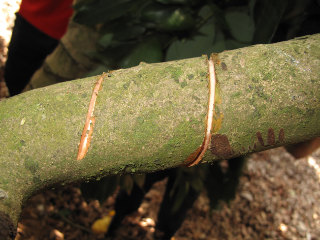 环割是在主干或大枝上用锋利的刀刃对树皮进行环形切割,深达木质部(图9)。树势旺、雨水多或温度偏高时进行闭合环割,树势稍弱、天气干旱时可进行不闭合环割。环割圈数视树势而定,壮旺树可割2圈,两圈相距10厘米左右;长势中等的树只割一圈。
