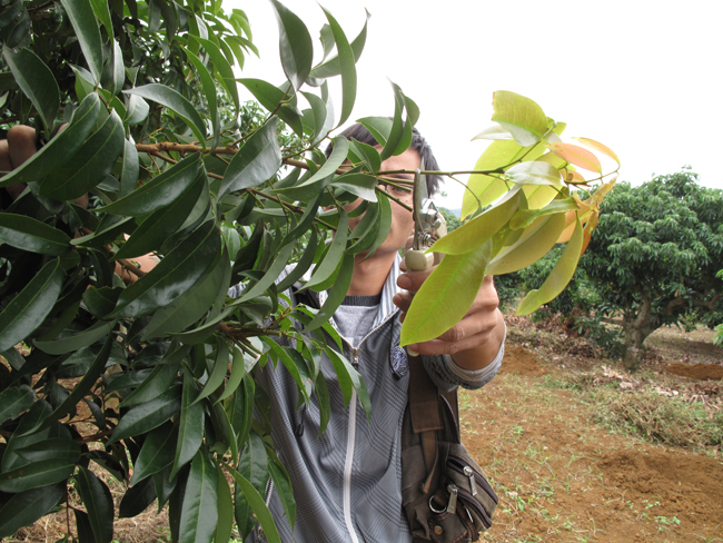 如果采用上述控梢措施效果不理想,冬梢长出后可用短截冬梢的方法进行控梢。方法是在冬梢基部2厘米处短截,不留叶片(图10),短截后5天内喷施40%乙烯利10毫升兑水15公斤,或加入15%多效唑10~15克/水15公斤混合喷施,以抑制再次抽生冬梢,并促进冬梢残桩成花。生产上要求早熟品种末次梢在10月老熟,中迟熟品种末次梢在11月中旬至12月初老熟,此时到荔枝园检查,如末次梢叶片呈淡绿色,或梢的硬度不够(弯压秋梢检查其弹性),说明不够老熟,可按上述方法进行短截处理,促进成花。