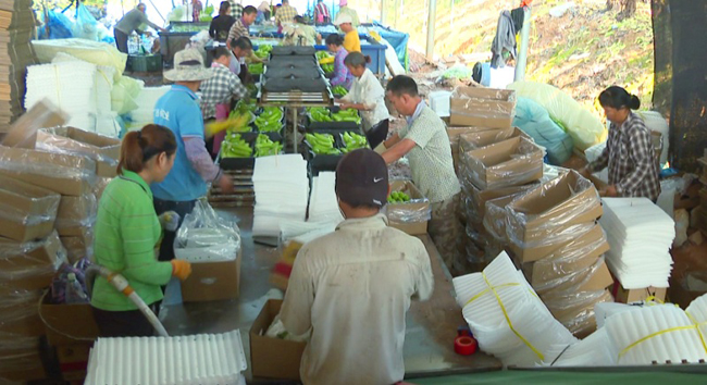 在绿意盎然的香蕉林里,每株香蕉树都有近五米高,粗壮的枝干上垂吊着一大串香蕉,香蕉树都被坠弯了腰。林子里,负责采收的工人们动作娴熟地将香蕉成串割下,再系上绳子,通过传送带送到清洗地点。