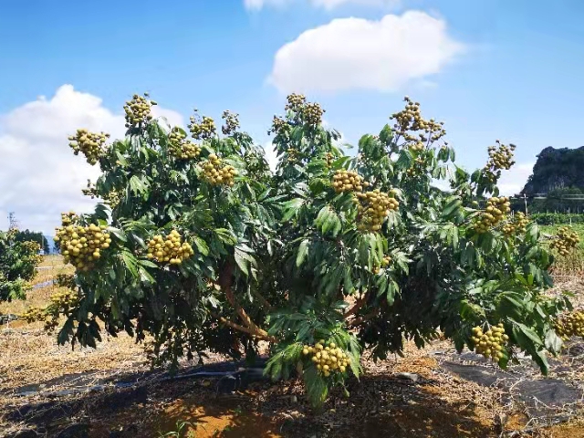 1.苗木及种植。培养嫁接大苗种植,宜采用土龙眼或水南一号龙眼作砧木。选择土壤疏松、土层深厚的缓坡地或丘陵山地建园,株行距4m×5m。挖大小为1m×1m×1m的种植坑,穴中施入绿肥、猪牛禽畜粪便、土杂肥等有机肥150~200kg,并在基肥中加入0.5~1kg过磷酸钙。