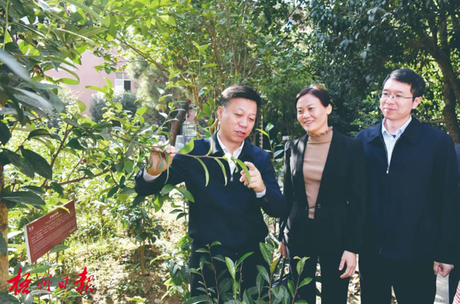 11月10日,市委书记蒋连生在六堡茶生产企业与相关从业人员探讨茶树种植情况。
