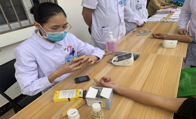 防城区人民医院的医疗专家和医护人员组成的医疗服务队,现场为村民进行免费量血压、测血糖,并就健康咨询、康复理疗等相关知识进行逐一解答。医疗专家们详细询问村民的既往病史以及近期身体状况等情况,并提醒他们发现问题及时到正规医院检查就医。
