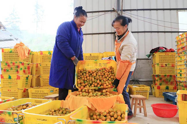 工人们正在将新鲜采收的金桔装筐。