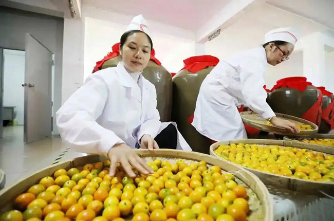 工人们正在分选金桔,准备制作金桔酒。