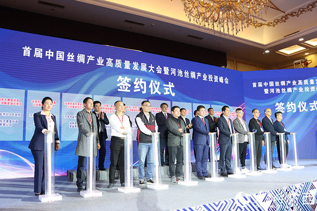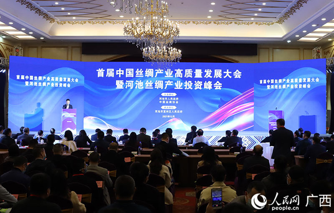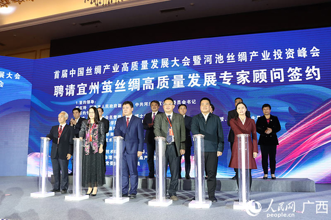 12月10日,首届中国丝绸产业高质量发展大会暨河池丝绸产业投资峰会在广西河池市宜州区举行,来自国家部委、自治区及河池市政府领导、国内各纺织丝绸工业企业、科研教学等机构知名专家学者共200多人参加了大会。