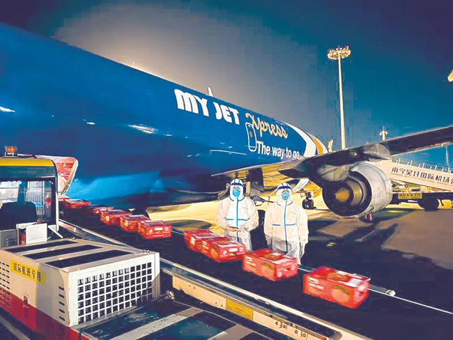▲南宁吴圩国际机场,一批武鸣沃柑被装载上国际货运航班。