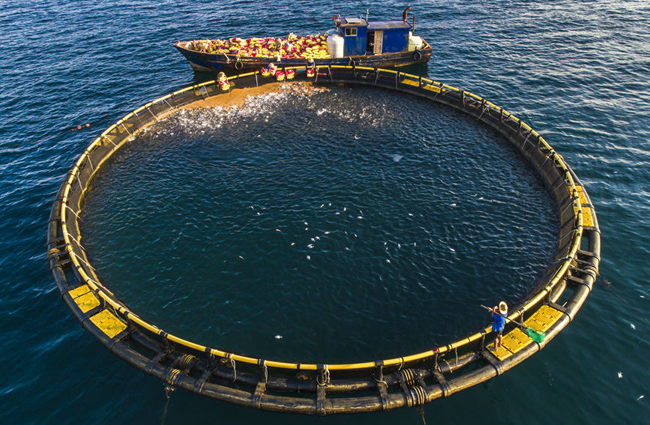 工人们正为金鲳鱼投喂饲料。