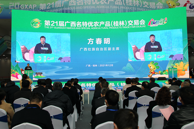 12月30日,第21届广西名特优农产品交易会(简称“农交会”)在桂林国际会展中心开幕。自治区人民政府副主席方春明在开幕式致辞并宣布农交会开幕,中国农产品市场协会会长张玉香通过视频致辞,自治区农业农村厅厅长、乡村振兴局局长黄智宇介绍本届农交会情况,桂林市市长李楚致辞。自治区农业农村厅一级巡视员郭绪全、梁雄等领导嘉宾出席开幕式。开幕式由自治区人民政府副秘书长梁磊主持。
