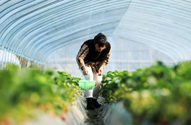 在融安县长安镇大坡村草莓种植基地,一名村民正在采摘草莓。