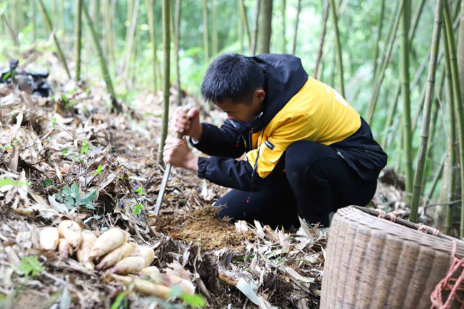 眼下正是冬笋采挖季,在广西金秀瑶族自治县的罗香乡平竹村,村民们一大早就背起锄头和箩筐走进郁郁葱葱的竹林里,收割鲜美的冬笋。他们在竹林里寻笋、采笋,再把装满筐的冬笋运出去售卖,为自己增添一笔收入。