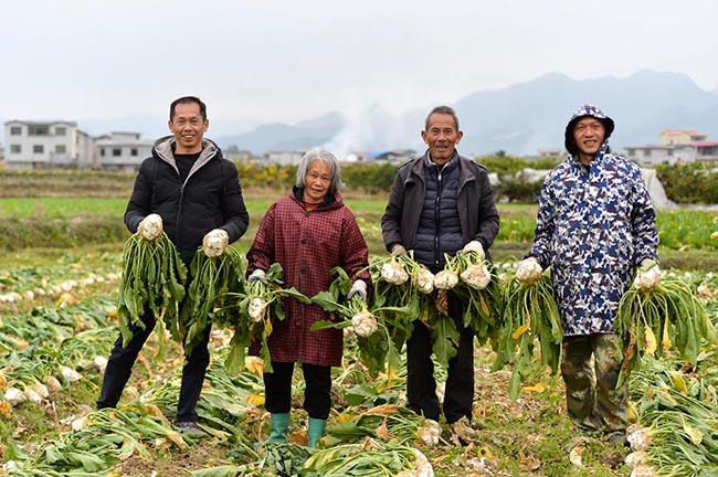村民展示丰收的头菜。