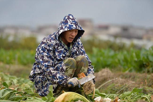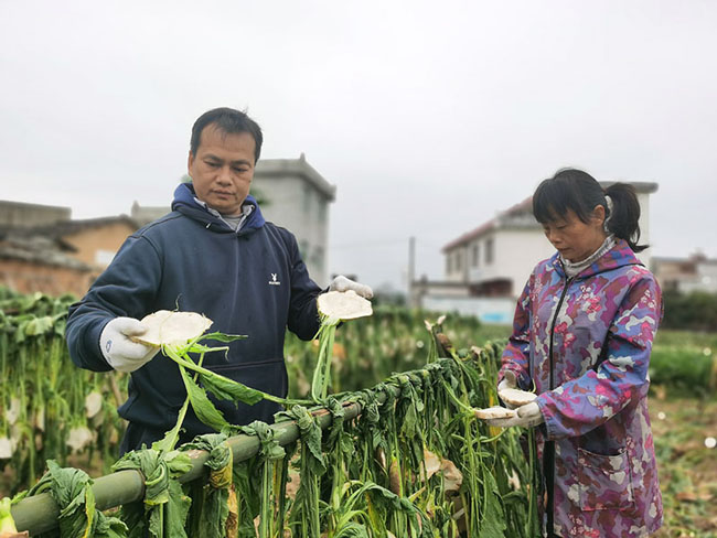 村民在田间切割头菜。