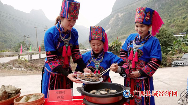 广西河池市都安瑶族自治县菁盛乡瑶族群众在现场烹制特色美食。