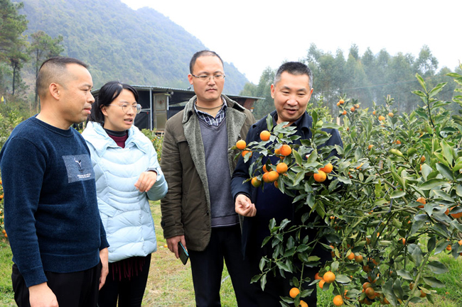 调研组了解脆蜜金桔的生长情况。