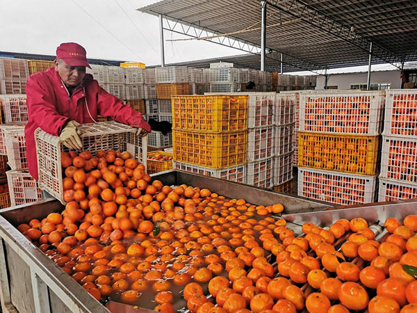 2月6日,在象州县罗秀镇金日果业的车间里,果农正忙着清洗、打包、分装、搬运沃柑,一片繁忙景象。
