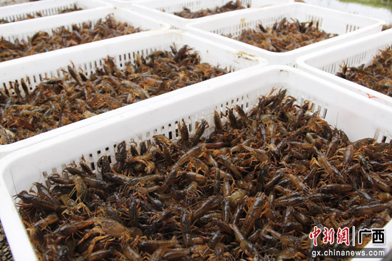 思界乡人民政府乡长刘坤燕介绍,该乡坚持党建引领,探索农企合作新模式,引进广西稻虾王公司生产经营,采取提前育苗、虾苗分养的方式繁育小龙虾,稻虾产业发展初见成效。全乡共完成土地流转3000亩,建成投产1400亩,投放种虾3.5万斤,截止目前,已放笼起虾苗12000斤进行分塘养殖,预计可以陆续繁育成品虾约15万斤,产值将达到500万元。