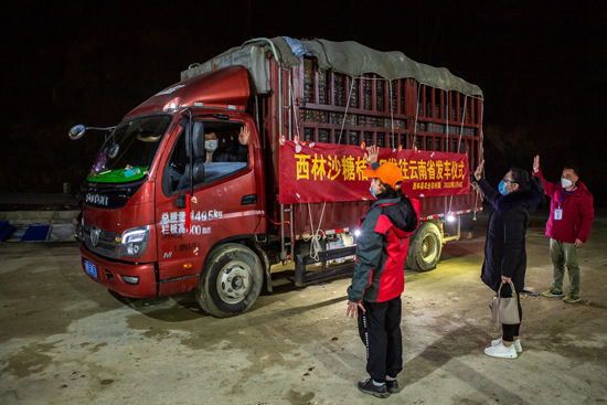 2月14日,一辆车身挂有“西林县沙糖桔发往云南省发车仪式”横幅的水果运输车缓缓地驶出西林县古障镇得丰果业厂区。