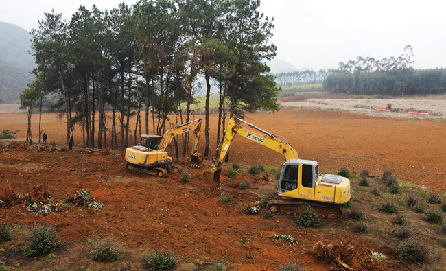 现场机械声四起,在桉树林,工人用机械把桉树砍掉,并将其连根拔起;在已清理好桉树的地里,农机正在翻地复垦。另一边,村民正在已开好沟的地里,把甘蔗种整齐放入再上肥料、覆盖,每个步骤都井井有条,好不热闹。