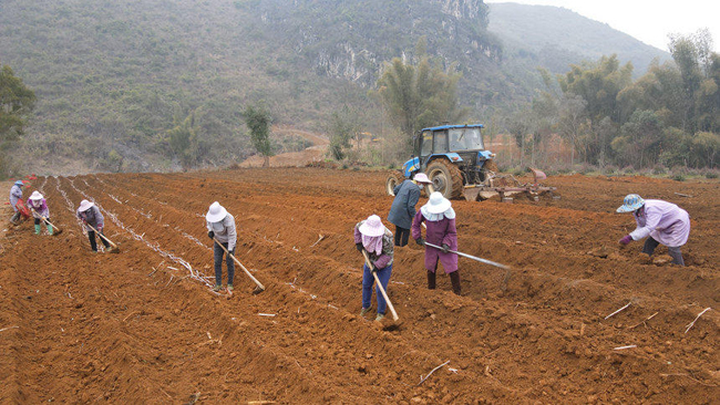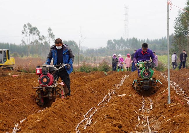 工人利用机械在清桉还蔗过后的地里种植甘蔗。