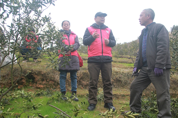 科技人员一行先后来到大将镇才妙村、大将镇雅士村、长安镇太平村实地考察。在大将镇才妙村,金桔种植户黄六成正在进行清园、剪枝、施肥等春季果园生产管理,专家组与黄六成分享了当前金桔管理要点,并针对低温雨雪天气提出科学应对措施和对果园的管理提出意见和建议。