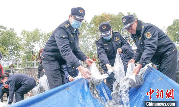 3月1日,2022年广西内陆水域禁渔启动仪式暨漓江鱼类增殖放流活动在广西桂林市漓江渔政放生码头举行。 蒋丰慧 摄