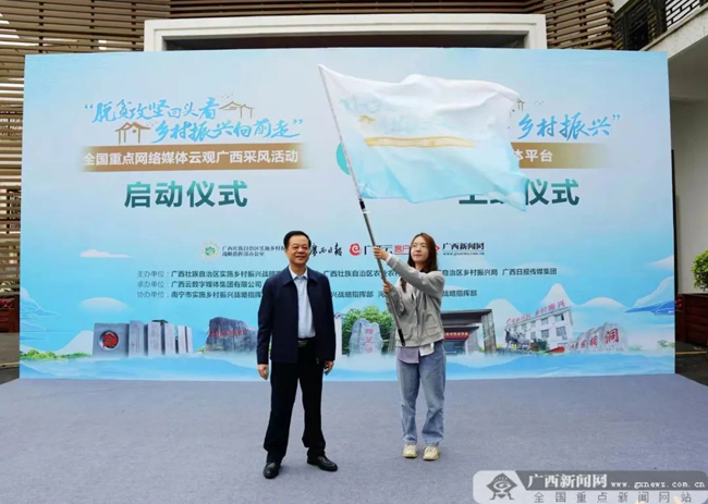 仪式现场,在自治区党委农办、自治区乡村振兴局、广西日报传媒集团、广西云数字媒体集团、南宁市委农办、百色市文明办、河池市农业农村局等相关负责人的共同见证下,“壮美广西乡村振兴”新媒体平台正式上线。平台上线后,自治区党委农办相关负责人向媒体代表授旗,“脱贫攻坚回头看 乡村振兴向前走”——全国重点网络媒体云观广西采风活动启动正式启动。