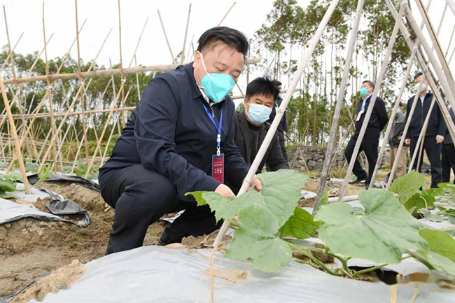 △ 林冠(左一)到钦北区大寺镇那桑村委下那冷村,调研农村疫情防控期间春耕生产和黑皮大冬瓜生产管理情况。王湖禄 摄