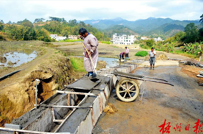 近日,在岑溪市大隆镇那蓬村,村民在利用新近建成的高标准农田水渠蓄水和耘田。