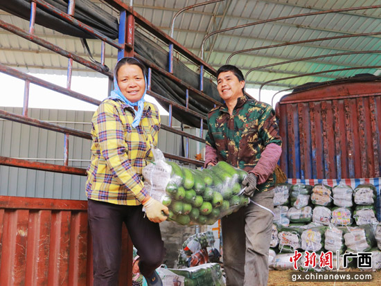 金陵镇辖区农户正将打包好的冬瓜搬上前来采购的大货车,准备销往各地。