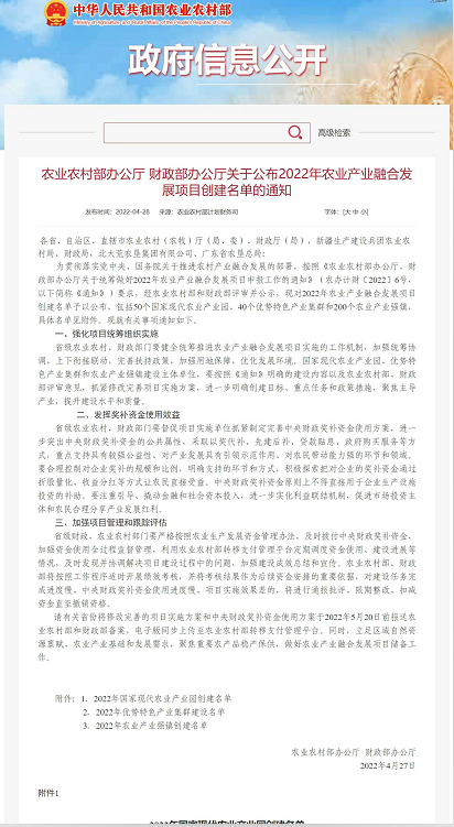 (原标题)农业农村部发布2022年农业产业融合发展项目创建名单
