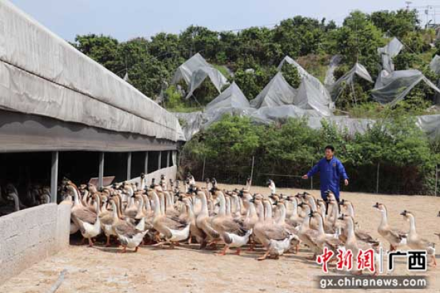 潘宇介绍,“目前,我家养殖场养有5000只的狮头鹅种鹅,年产鹅苗10万只,每只价格40元人民币,鹅苗主要通过线上线下的方式销往广西各地,年收入40万元。”