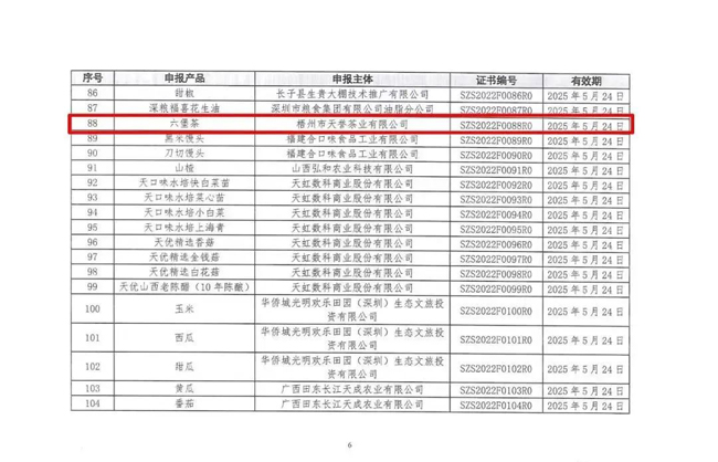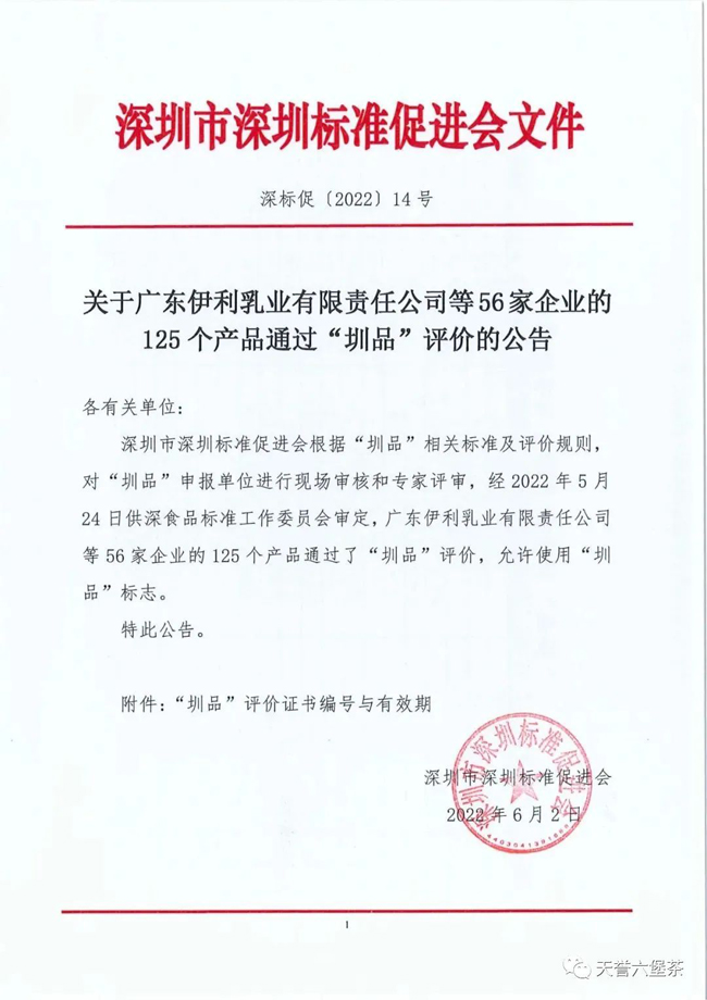 2022年6月2日,深标促{2022}14号文件公告,梧州市天誉茶业有限公司生产的六堡茶其生产加工过程符合供深食品评价要求,成为梧州市首家六堡茶认证“圳品”企业,允许使用“圳品”标识。