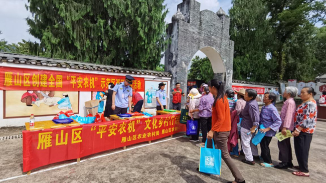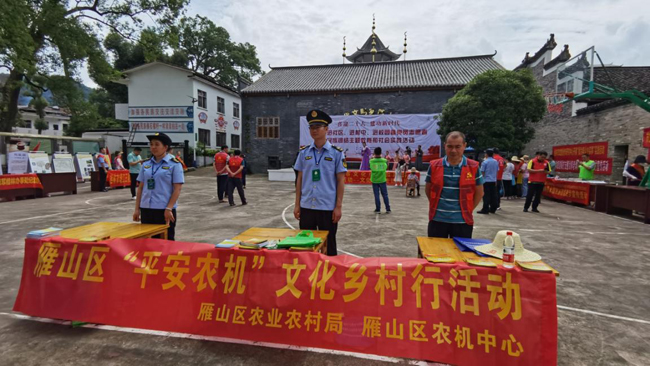 为了大力宣传党和国家安全生产的方针政策、农机法律法规和安全知识,推进农机安全文化建设,增强全社会农机安全生产意识,转变提升为广泛认同遵守的社会文明观念,创造有利于农机安全生产健康发展的社会文明环境,促进社会主义新农村建设。6月15日,雁山区创建全国“平安农机”示范区巡回宣传暨“平安农机”文化乡村行活动在雁山区草坪乡潜经村举行。结合当地实际,演出以农机安全生产为主题,用彩调、小品、歌曲等多种方式传送了农机安全的重要性,演出通俗易懂,与生活很贴切,吸引很多观众来观看。除演出外,通过悬挂横幅、展出宣传图片、向群众发放安全宣传资料,利用媒体多种渠道,进一步宣传农机安全知识,为创建全国“平安农机”示范区工作深入人心、家喻户晓。