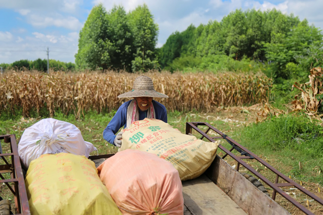 7月12日,象州县马坪镇新庆村的玉米地里,村民覃作平正在搬运刚收获好的玉米。